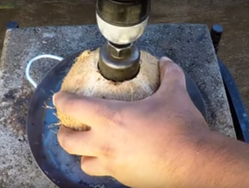 Esse coco é bem grande e teve o furo feito de forma bem centralizada para receber o conteúdo derretido do cobre. Como a casca é boa para reter líquidos, o cobre acabou tendo o seu calor retido e tudo começou a aquecer por dentro, provocando fervura.